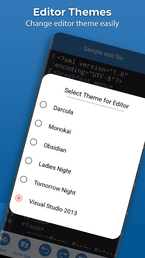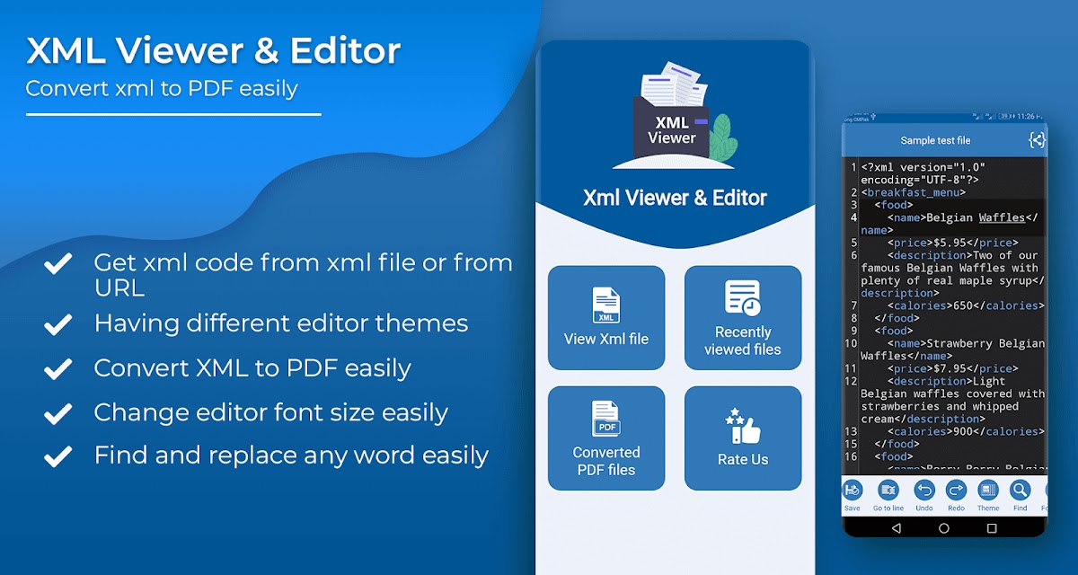 С помощью редактора xml вы можете легко отменить и повторить код, а также легко перейти к определенному номеру строки. В редакторе xml вы можете легко искать любое слово, а также легко заменять все результаты поиска любым другим словом. Xml Viewer имеет другую тему, которую вы можете легко применить к редактору. В приложении для чтения xml вы можете легко изменить размер шрифта редактора.
