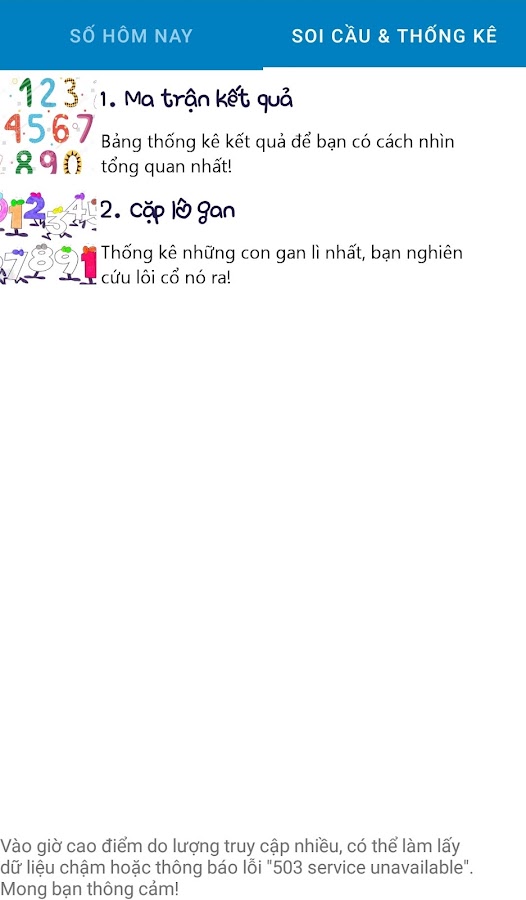Пожалуйста, загрузите приложение XSMN Soi Standard, чтобы испытать его, приложение находится в процессе разработки, поэтому будет много новых функций, вам следует обновить его до последней версии!
