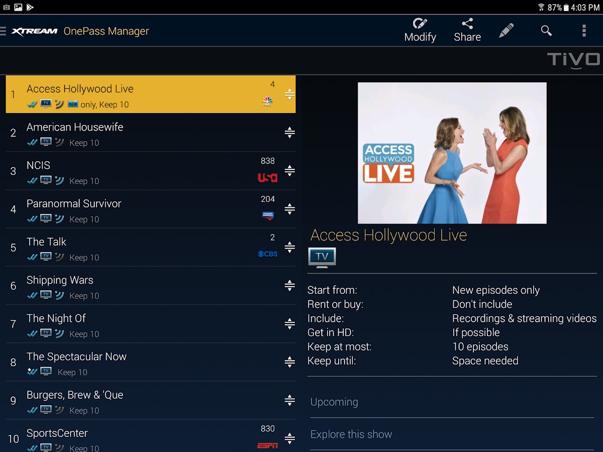 • Просмотр и управление записями в Мои шоу.