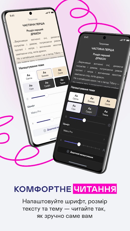 • Ознакомьтесь с комфортом — настраивайте шрифт, размер текста и тему