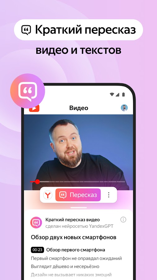 Яндекс Браузер бережёт ваше время: благодаря нейросети YandexGPT он кратко пересказывает тексты и даже видео (как русские, так и иностранные).