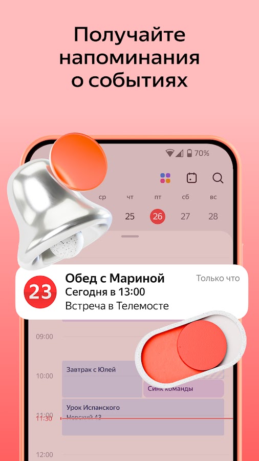 Получайте напоминания о событиях через пуш-уведомления. Вы сами выбираете, за сколько времени до начала мероприятия хотите получить уведомление. Это особенно удобно, если у вас насыщенный график или когда обязательно нужно быть на встрече вовремя.