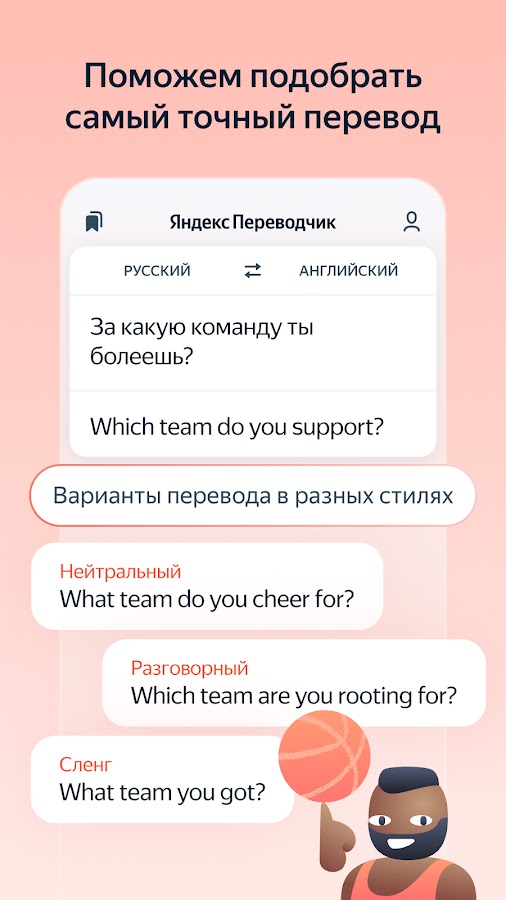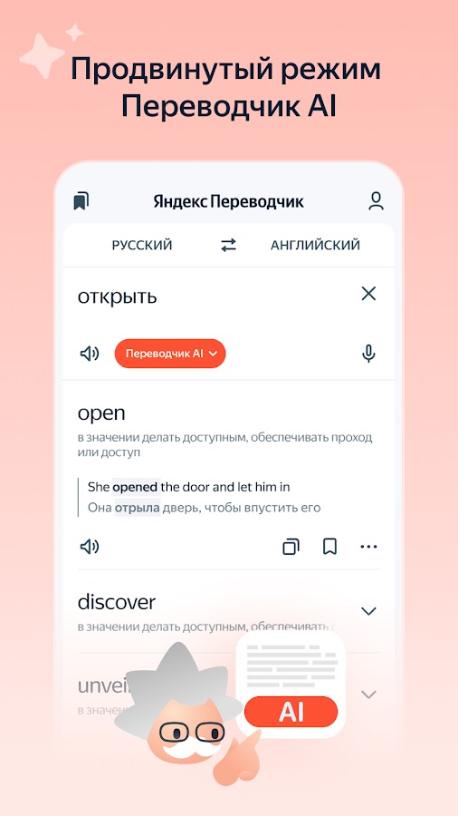 Яндекс Переводчик умеет переводить целые веб-сайты прямо внутри приложения, избавляя от необходимости переключаться между браузером и переводчиком. На Android 6.0 и выше доступна интеграция через контекстное меню: выделите текст в любом приложении и выберите «Перевести» — результат появится в новом окне. Словарные статьи с примерами употребления помогают понять не только значение, но и контекст использования слов. А для объёмных текстов (статей, документов, писем) в приложении есть ИИ-режим на основе больших языковых моделей, который сохраняет стиль оригинала и обеспечивает высокую точность перевода.
