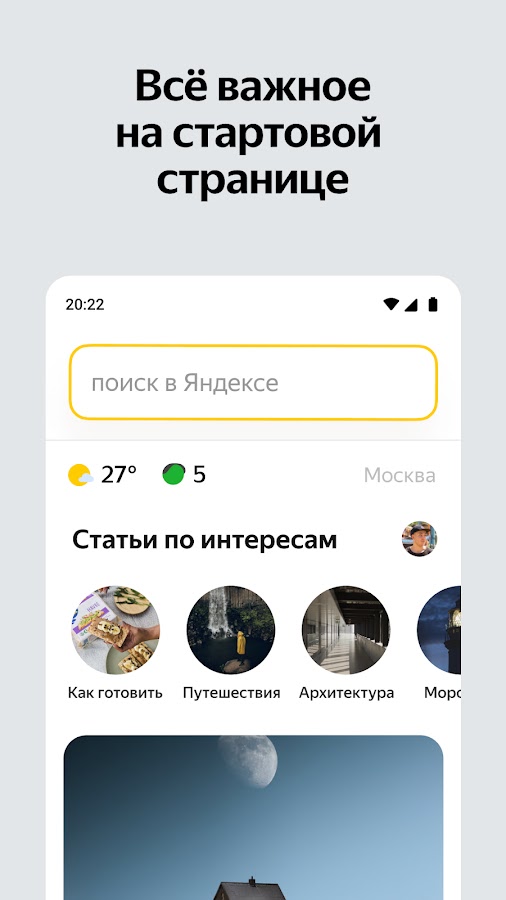 В приложении Яндекс Старт всё нужное на одном экране и любую страницу можно сделать главной. Всегда под рукой удобный поиск, погода и пробки прямо на стартовой странице; перевод страниц, картинок и видео на сайтах в интернете.