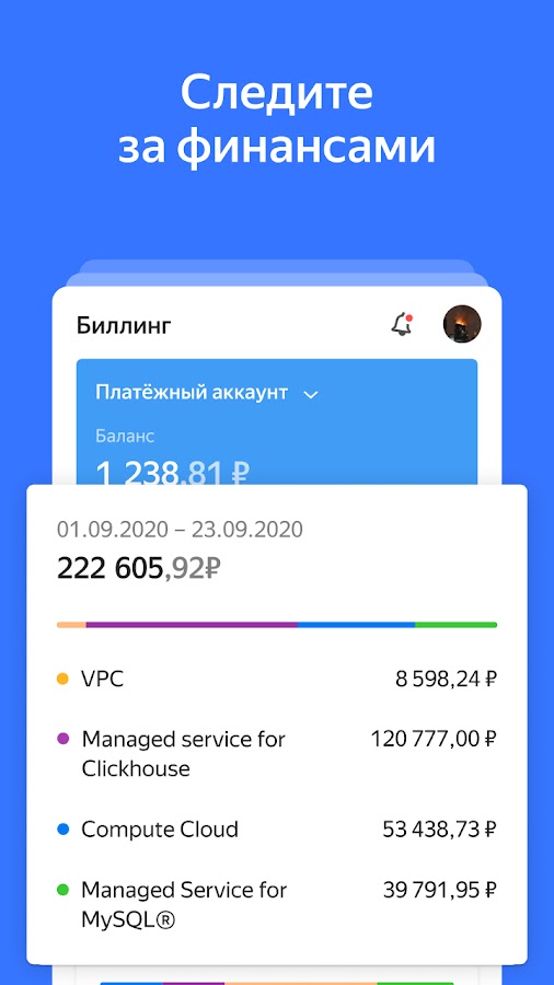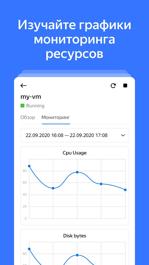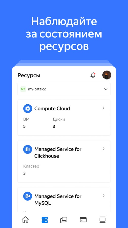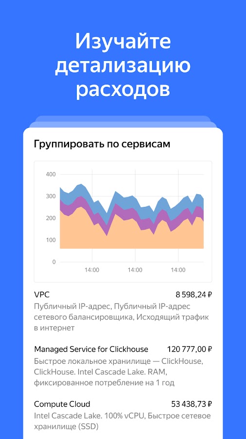 • ресурсы: на страницах ресурсов вы увидите детальную информацию о работе всех ваших виртуальных машин, дисков, бакетов, развернутых баз данных и кластеров Kubernetes, графики мониторинга, сведения об операциях;