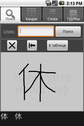 Японско-русский словарь иероглифов и слов. Основан на оригинальной системе поиска по начертанию или графическим элементам, также можно искать по он- или кун-чтению или значению.