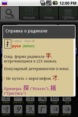 Для каждого иероглифа выводятся чтения, варианты перевода, примеры использования, правильное начертание и произношение.