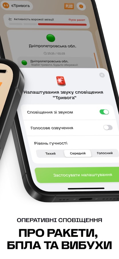 Ви отримаєте звуковий сигнал, коли у вашому регіоні буде оголошено повітряну тривогу, загрозу ракетного удару, артобстрілу, дронів або керованих авіабомб (КАБів).