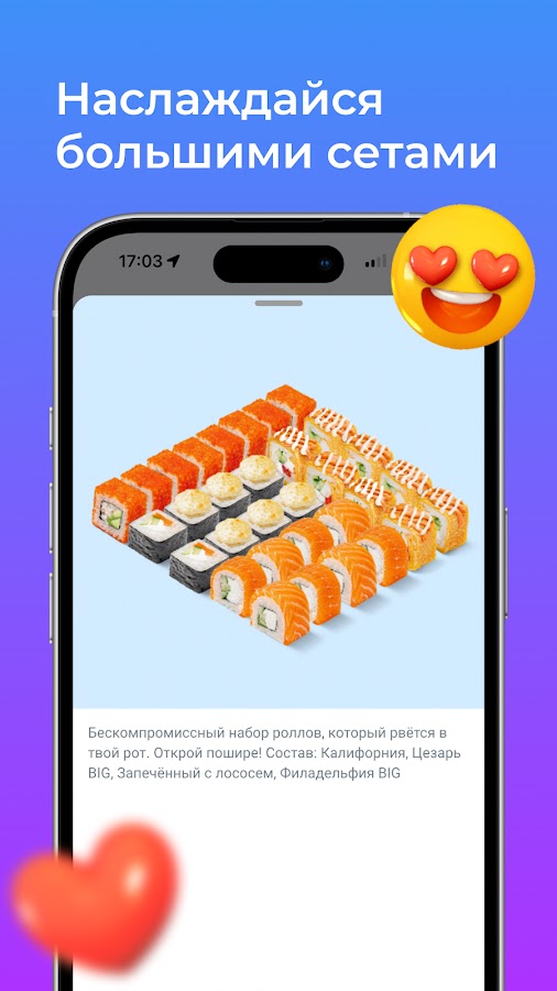 Так пусть каждый день будет такой же энергичный и весёлый, как суббота! А символичное название вызывает улыбку у вас – молодых и активных любителей суши с отличным чувством юмора.