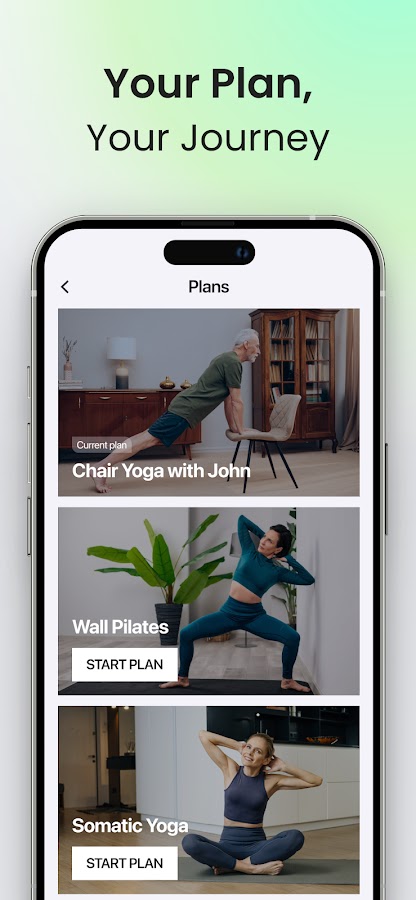 • Индивидуальные планы занятий: пилатес у стены, йога на стуле, соматическая йога, классическая йога или йога на диване