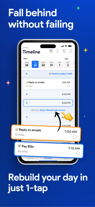 Точно видите, что вам нужно делать, когда вам нужно это делать и что делать дальше, когда планы меняются. Никаких жестких графиков. Никаких идеальных дней. Просто гибкий план с блоками времени, который адаптируется в режиме реального времени.