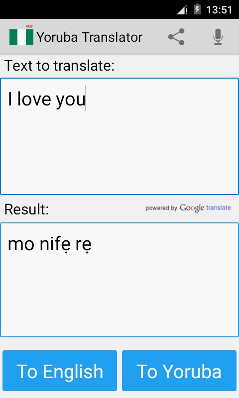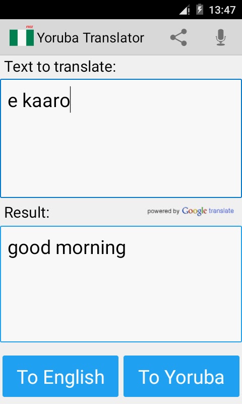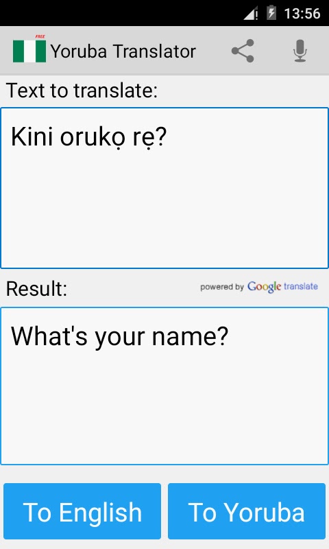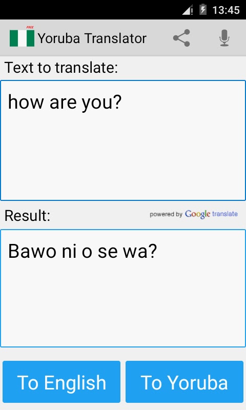 Это бесплатное приложение может переводить слова и тексты с английского (или русский) для йоруба, а с йоруба на английский язык. Очень полезное приложение для легкого и быстрого перевода, который также работает как словарь!