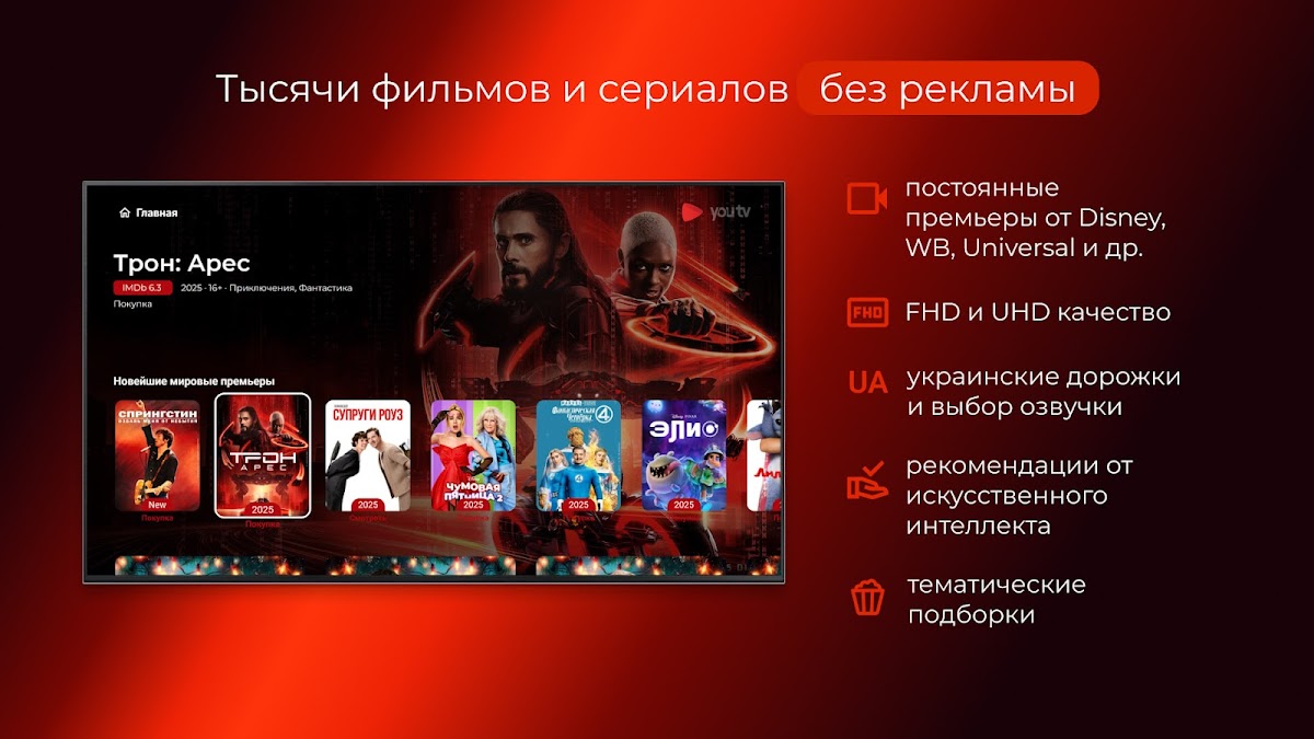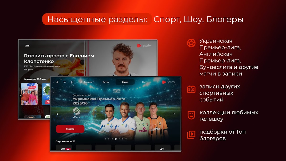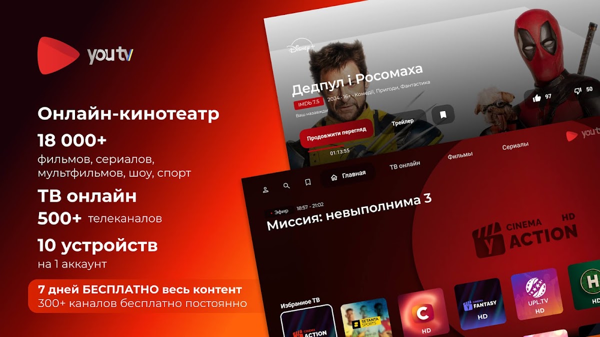 youtv – онлайн телевиденье Украины с БЕСПЛАТНЫМ доступом на 7 дней без привязки карты к 500+ каналов (400+ HD), 18000+ топ фильмов и контенту HD/Full HD качества.