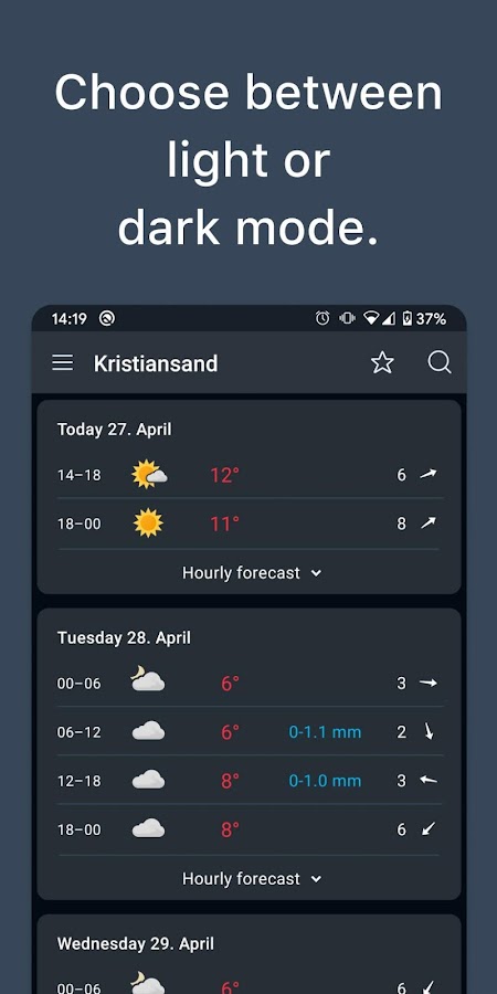 Приложение для Android отличается от всего, что вы видели в области прогнозирования погоды: пролистайте красивое и анимированное небо, чтобы увидеть, как погода меняется ежечасно, и одновременно получайте все необходимые сведения. И если в течение следующих 90 минут будут осадки, мы сообщим вам об этом в нашем прогнозе.