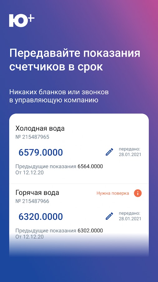 • Посмотреть предыдущие показания счетчиков и передать новые;
