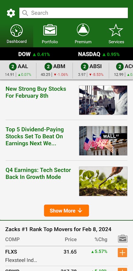 Контент для этого приложения предоставляется Zacks.com и предлагает доступ к проверенному рейтингу Zacks — и его среднему приросту + 26% в год — и собственное исследование Zacks для успешного трейдинга в дороге