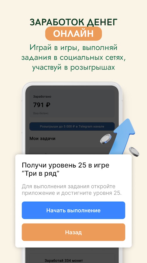 Заработок без вложений с выводом денег – основа нашей платформы. Вам не нужно платить, чтобы начать зарабатывать. Просто установите приложение, зарегистрируйтесь и начинайте зарабатывать реальные деньги. Каждый пользователь получает доступ к платным заданиям, где можно заработать деньги за задание – от простых лайков и подписок до прохождения тестов и регистрации на сайтах. Все задания за деньги с выводом доступны онлайн, их можно выполнять в телефоне в любое удобное время.
