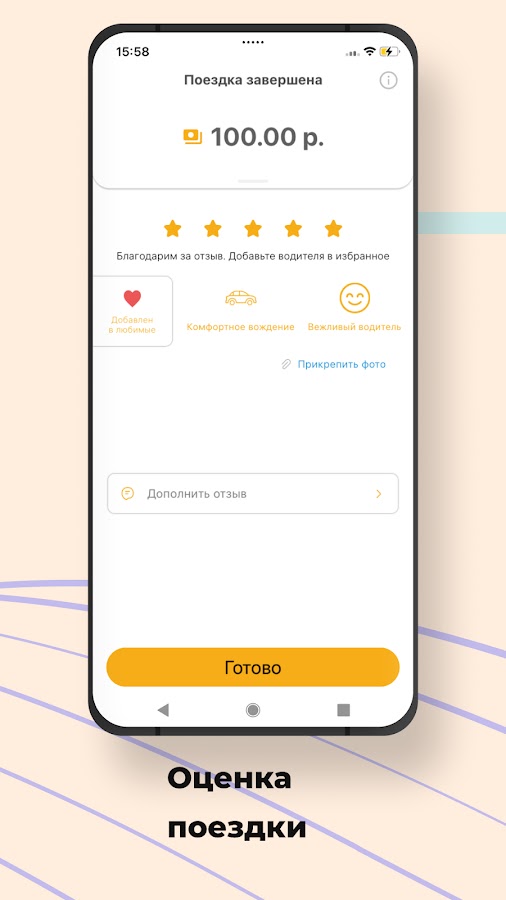 Поставьте оценку водителю, напишите отзыв или выберите реакцию из готовых шаблонов. Прикрепите фотографию к отзыву, оставьте чаевые или посмотрите детализацию платежей после поездки.