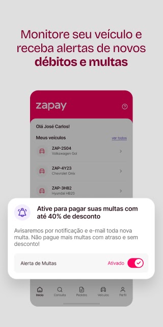 С Zapay вы можете проверить свой номерной знак, просмотреть все непогашенные задолженности, такие как IPVA (транспортный налог), штрафы, просроченные лицензии, активировать оповещения о штрафах и получить свидетельство о регистрации транспортного средства (CRLV) — все это за считанные минуты и не выходя из дома. Приобретите автомобильную защиту и получите проездные билеты, чтобы путешествовать без забот!