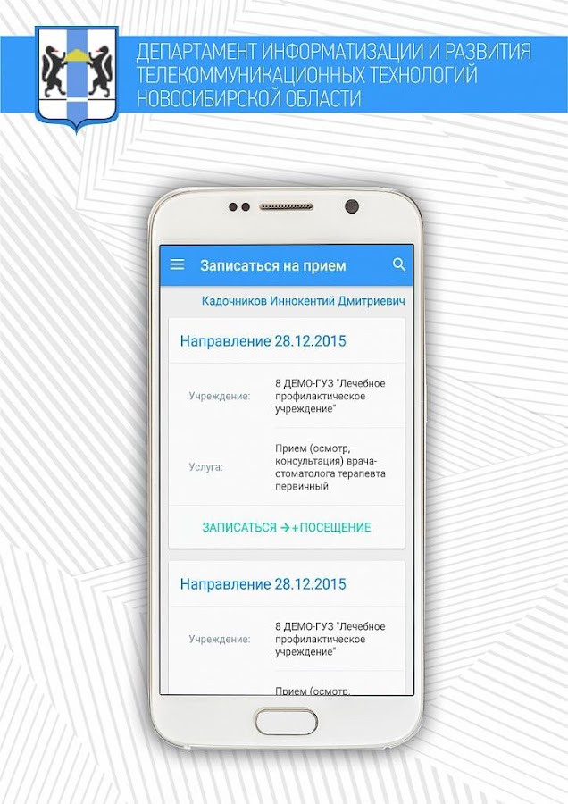 Приложение «Запись на прием к врачу» предназначено для записи на прием к врачу в медицинские учреждения Новосибирской области, обслуживающие граждан по полисам ОМС.