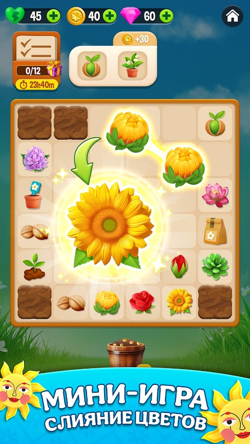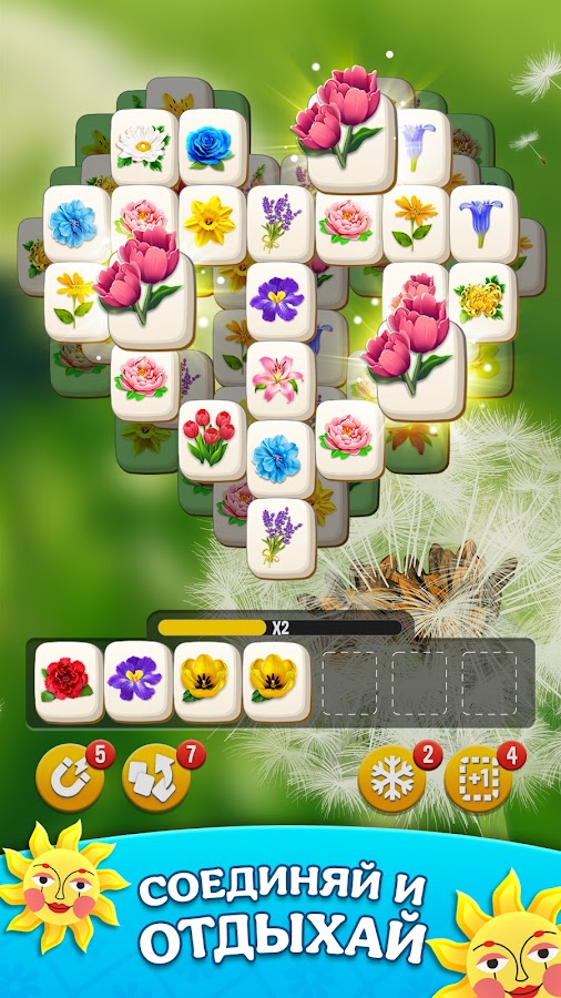 Совместите 3 той же цветочной плитки, чтобы очистить их и забить. Совместите как можно быстрее, чтобы забить больше стартов. Совместите все плитки в ограниченное время уровня проходов. Не забудьте использовать бустеры, чтобы проще пройти уровни.