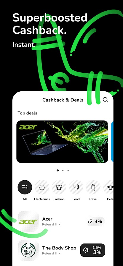 ZEN.COM предлагает вам мгновенный кэшбэк за онлайн-покупки в сотнях популярных магазинов. Кэшбэк-вознаграждения работают с известными брендами, такими как AliExpress и Temu, а также со многими другими магазинами. Выбирайте лучшие и самые актуальные предложения, экономьте деньги с помощью специальных предложений мгновенного кэшбэка и получайте реальные деньги обратно — без баллов, без ожидания. Экономия на повседневных онлайн-покупках становится легкой.