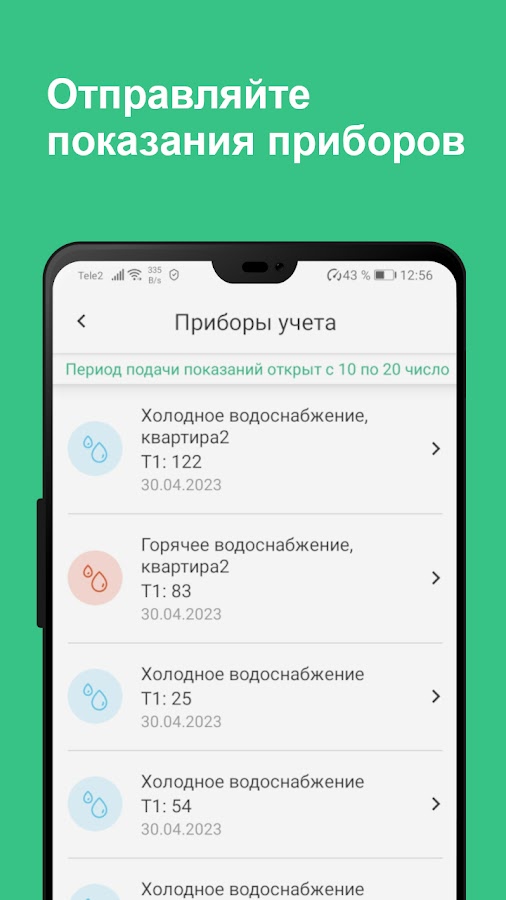 Все индивидуальных приборы учета выводятся в приложении, можно передать показания за текущий месяц и посмотреть историю.