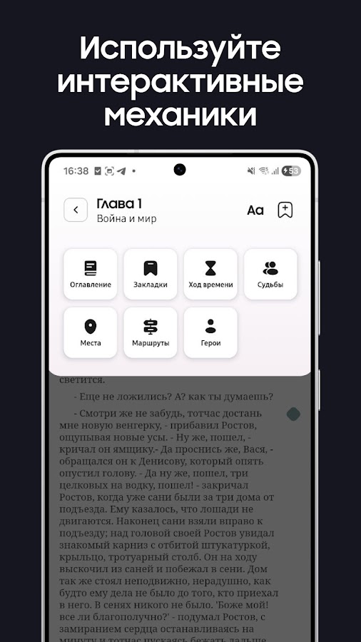 Откройте для себя удивительный способ читать книги так, как вы еще не пробовали с приложением Samsung Живые страницы. Вы не просто следите за развитием сюжета, вы полноценно погружаетесь в историю и проживаете ее вместе с героями. В основе приложения для чтения книг — тщательно отобранная коллекция русской литературы, объединяющая классические произведения, начиная с А.С. Пушкина и Л.Н. Толстого и заканчивая лучшими образцами современной прозы, включая таких авторов, как Евгений Водолазкин и Наринэ Абгарян.
