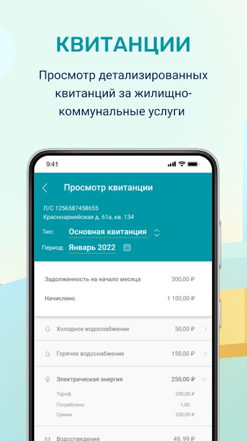 Просмотр актуальных квитанций за жилищные, коммунальные услуги с расшифровкой по статьям расчетов.