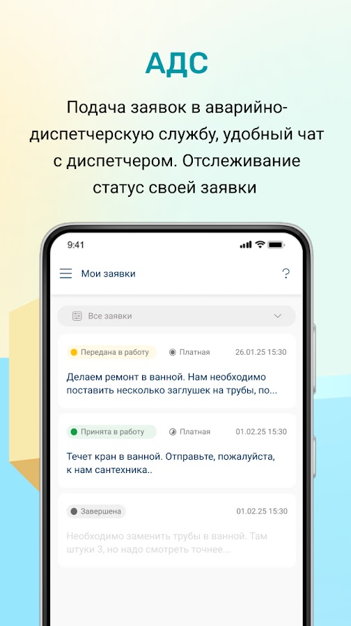 Подача заявок в Диспетчерскую службу ЖКХ. Просмотр истории и статусов ранее созданных заявок.