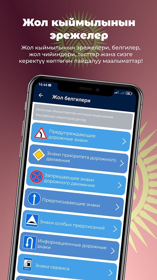 Бул ыңгайлуу колдонмо — бул Кыргызстандын МАИсинде жол эрежелери боюнча теориялык экзаменге даярданууга жардам бере турган эң сонун тренажер.