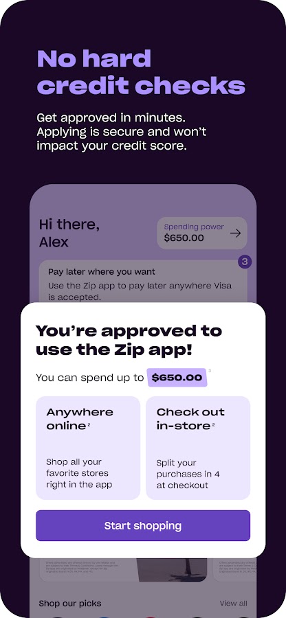 ⁴ Ваша предполагаемая покупательная способность представляет собой оценку вашей потенциальной платежеспособности на определенный момент времени, не гарантируется и зависит от ряда факторов. Zip или WebBank могут снизить вашу предполагаемую покупательную способность по своему разумному усмотрению, в том числе в случае наличия у вас ранее непогашенного остатка или просроченной задолженности. Ваша предполагаемая покупательная способность не является открытой кредитной линией. Каждая транзакция рассматривается отдельно для одобрения. Для получения дополнительной информации см. условия и положения.