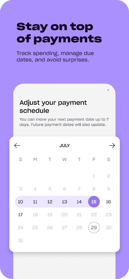 Без жестких проверок кредитной истории и без ущерба для вашего кредитного рейтинга. Мы напомним вам о сроках оплаты, чтобы вы были в курсе каждого платежа.