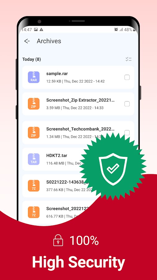 С Unzip: Zip File Opener кажется, что на вашем экране происходит волшебство, пока приложение обрабатывает данные. Всего за несколько секунд программа значительно облегчит файл для отправки вашему начальнику. Все, что вам нужно сделать, это нажать кнопку и позволить программе сделать свою работу. Это помогает в моменты, когда память вашего телефона полностью заполнена. Идеальные результаты достигаются благодаря интеллектуальному режиму, активированному в Zip Maker: Rar File Extractor.