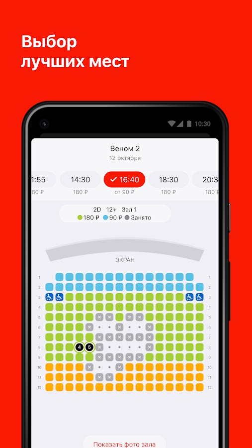 Забудьте о поиске идеального места в кинозале. Наше приложение предоставляет схему зала с подробным описанием каждого места, чтобы вы могли выбрать наилучшее местоположение для просмотра.