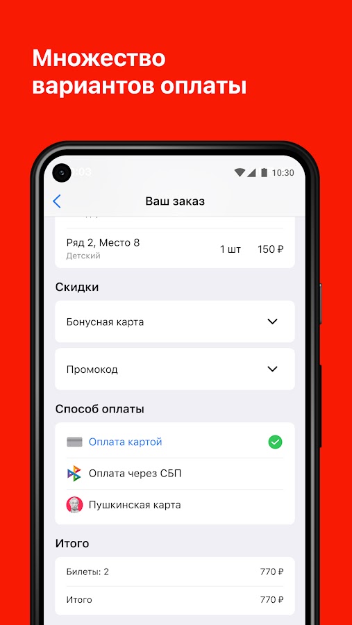 Купите билеты в кинотеатр всего в несколько касаний! Используйте вашу банковскую карту или Пушкинскую карту для безопасной и удобной оплаты.