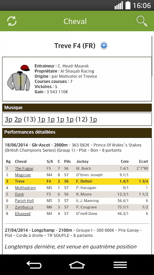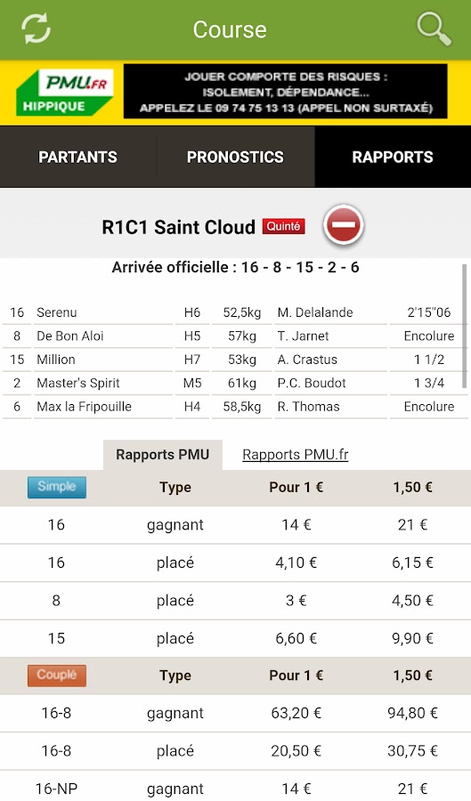 — Отчеты о прибытии и PMU о Tiercé, Quarté, Quinté, 2 из 4, Multi, Pick 5 и одиночной игре.