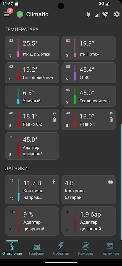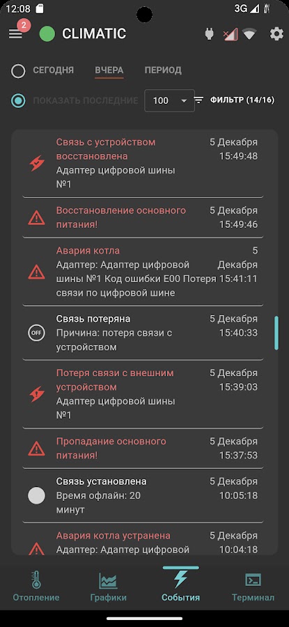 • запись и хранение значений параметров системы отопления, ведение журнала событий (статистика), отображение графиков работы;