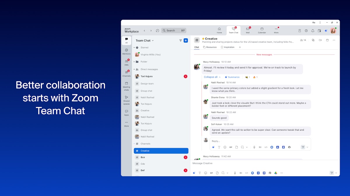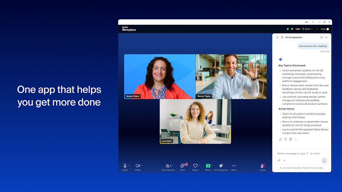 Zoom Workplace объединяет совещания, командный чат, телефон, планировщик, электронную почту и документы в одном приложении. Благодаря встроенному ИИ-помощнику Zoom, который поможет вам подводить итоги, составлять черновики и организовывать свой день, вы сможете сделать больше, не отвлекаясь на рутинную работу.
