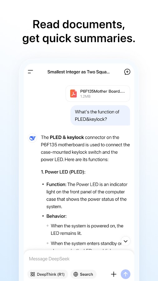 DeepSeek — мобильный AI для глубокого поиска и анализа данных. Приложение помогает находить нужную информацию, структурировать её и генерировать краткие отчёты. Полезно для аналитиков, маркетологов и исследователей.