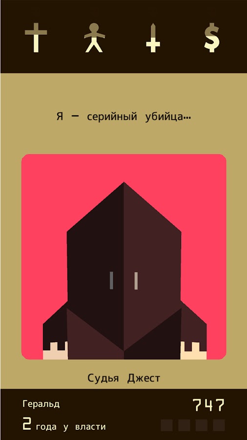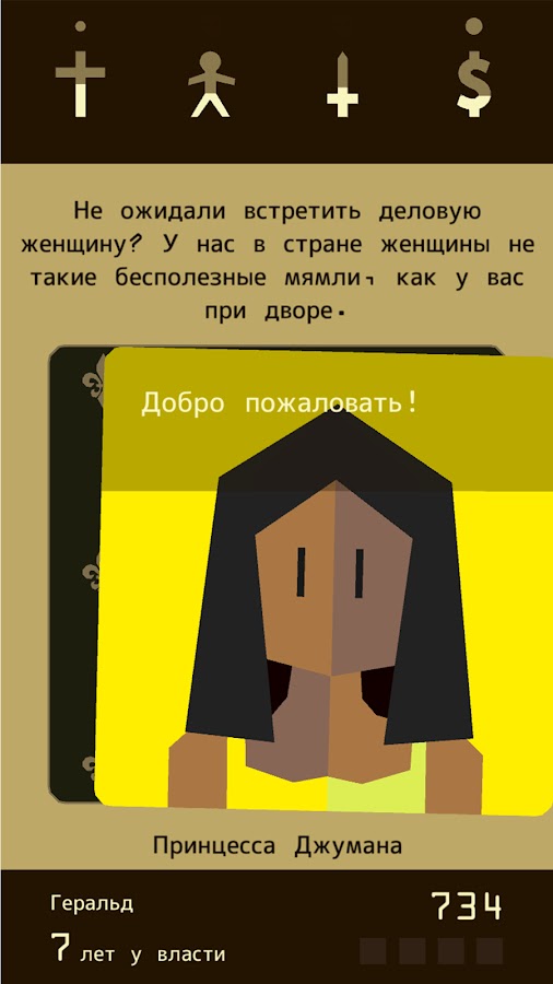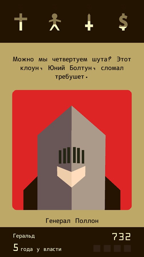 Вы правите королевством, принимая решения простыми свайпами. Балансируйте между народом, армией, церковью и казной, чтобы не потерять корону.