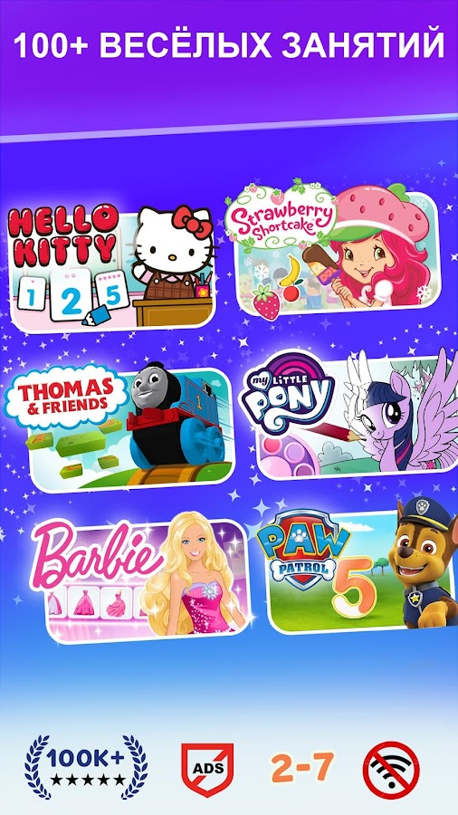 Budge World объединяет более 100 обучающих игр с персонажами популярных мультфильмов: Барби, Щенячий патруль, My Little Pony, Томас, Hello Kitty, Трансформеры.