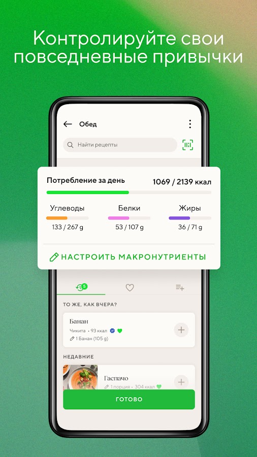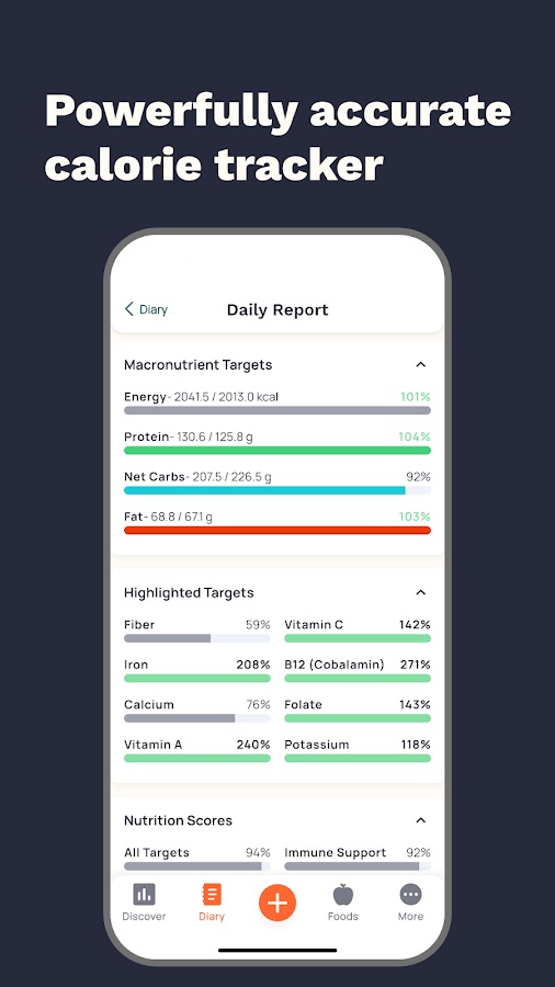 - Подробный трекинг витаминов и минералов (более 80 микронутриентов).