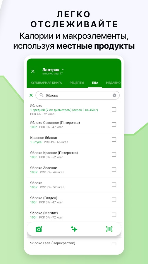 - Удобное сканирование штрих-кодов для быстрого добавления продуктов.