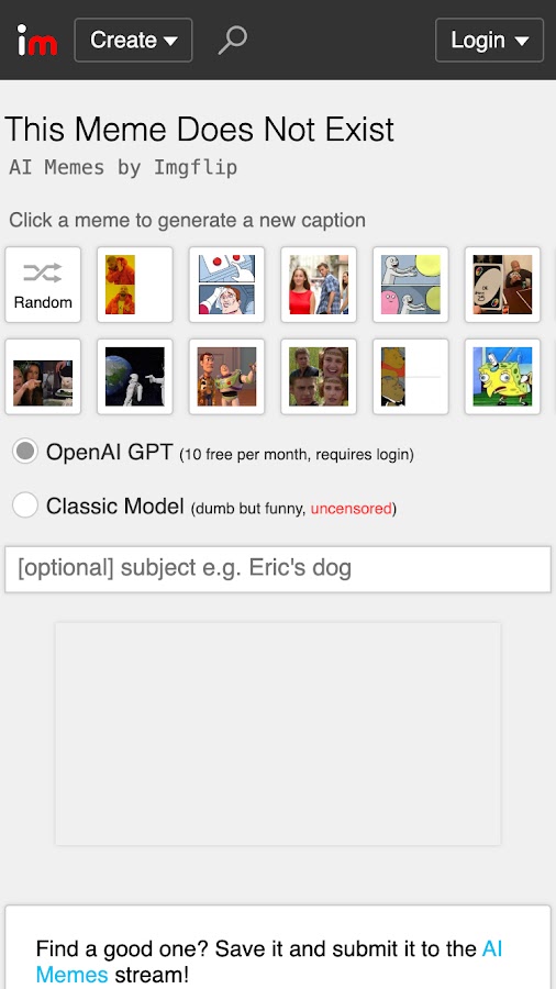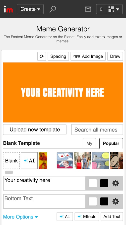 Imgflip — известный онлайн-сервис, который также имеет мобильное приложение. Оно позволяет создавать мемы, GIF и комиксы, использовать готовые шаблоны и добавлять текст. Инструмент отлично подходит для тех, кто хочет экспериментировать с формой и содержанием мемов.