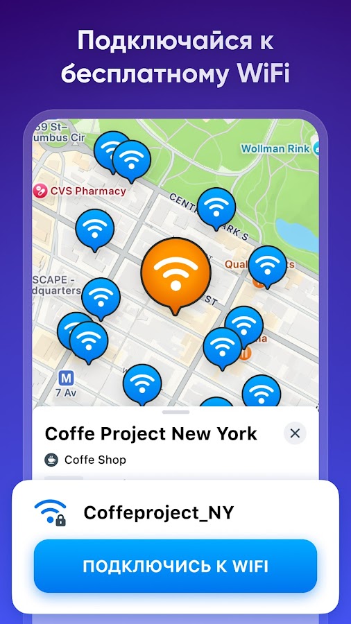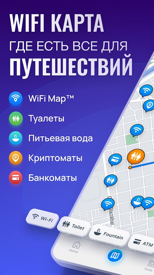 WiFi Map показывает точки доступа к бесплатному или доступному Wi-Fi, позволяет делиться паролями и находить интернет в любой точке мира, что особенно полезно в путешествиях и командировках.