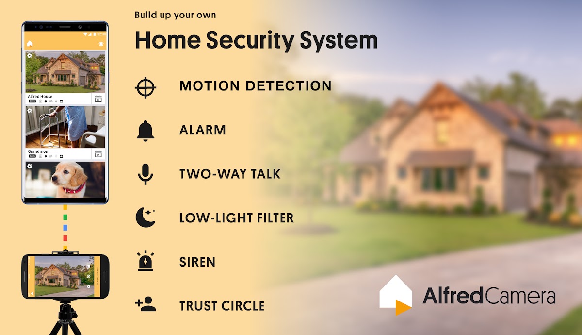 | Alfred | Превращение старого смартфона в камеру, облачное хранение, детекция движения, уведомления, двусторонняя аудиосвязь | Любые смартфоны Android/iOS |