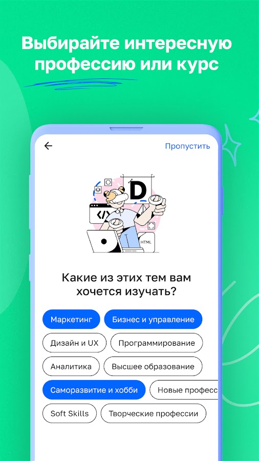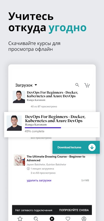 | Udemy | Тысячи курсов по различным темам | Любой уровень | Офлайн-доступ, система рекомендаций, обучение в собственном темпе |