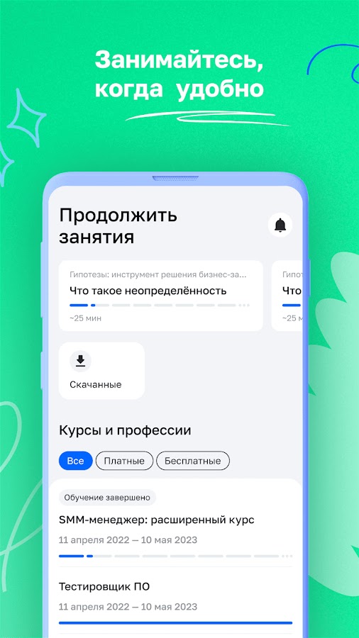 Да, все перечисленные приложения работают как на смартфонах, так и на планшетах с Android и iOS, обеспечивая удобный просмотр видеоуроков, прохождение тестов и выполнение практических заданий на большом экране.