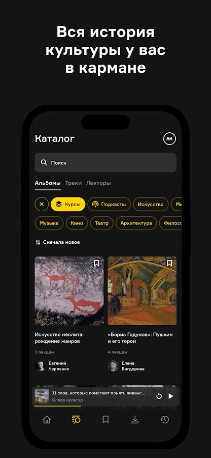 Arzamas — это образовательный проект, который делает знания по истории, искусству, культуре и науке доступными в формате подкастов и лекций. Приложение позволяет слушать курсы в удобное время, сохранять записи для повторного прослушивания и углубляться в тематику с экспертами. Это идеальный вариант для тех, кто хочет развиваться культурно и интеллектуально.